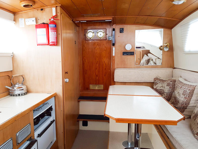 Moving towards the centre of the cabin to starboard is an L-shaped dining area fit for seating 4 people comfortably. The table can be dropped down to form a double berth. To port is the galley, complete with a double ring hob, grill, oven and sink, with covers that provide a large worktop surface.