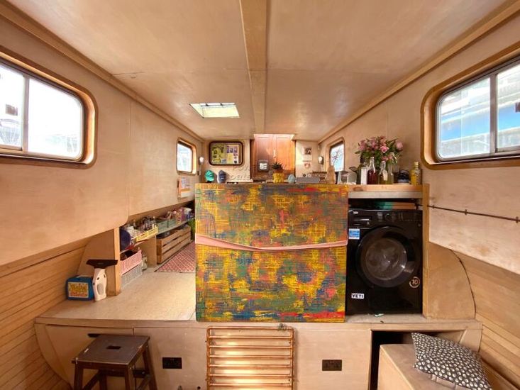 Step aboard into the spacious wheelhouse - a versatile entertaining space with panoramic views across the Thames. This area flows effortlessly into a bespoke galley kitchen, then continues down into a welcoming open-plan living area. A large overhead skylight floods the space with natural light, while dimmable, wireless-controlled LED lighting sets the mood perfectly for evenings in.