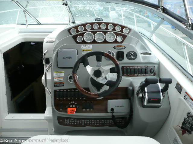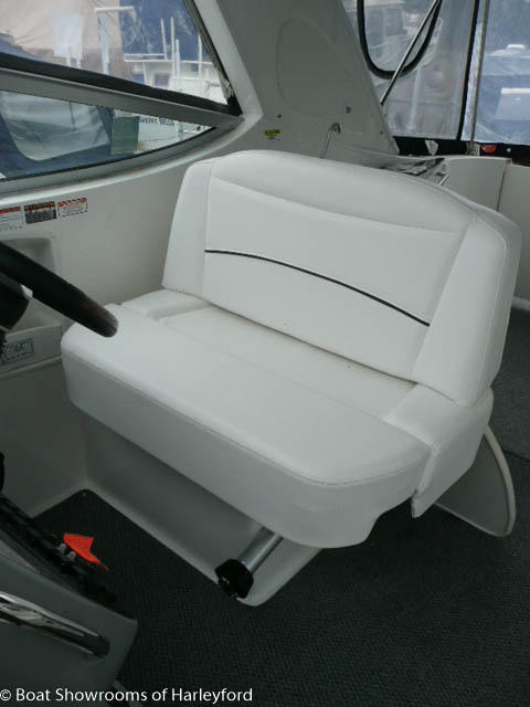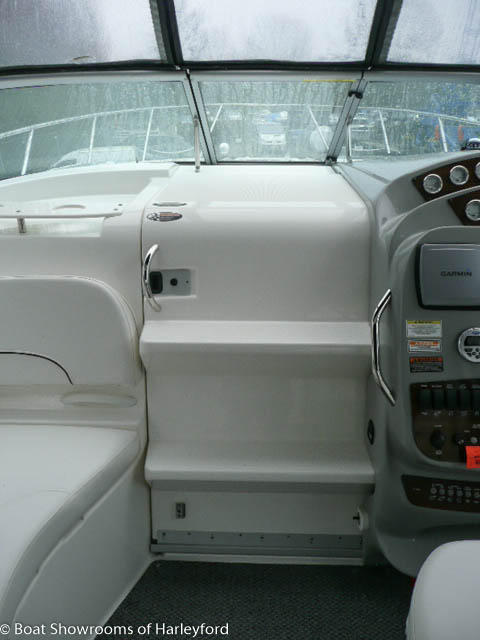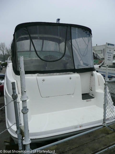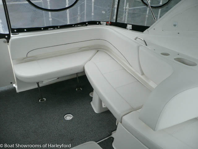 Up 3 steps to the spacious Cockpit. Helm to starboard with all main instruments and controls, 12v sockets, Jensen Audio controls. The helm has a bench style seat, opposite you have more bench seating wrapping around the port side of the cockpit. The aft section has a removable table with access to the engine bay under the seating. Also a small "Wet Bar" with sink, cold tap, fridge/freezer, built in bin and cupboard. The cockpit has a radar arch with speakers inbuilt and a 2 part canopy connecting either side. The GRP door to the main cabin has steps moulded in for access to the forward deck. Next to the transom door to the bathing platform you have more Jensen Audio controls and deck shower. Large bathing platform with swim ladder.