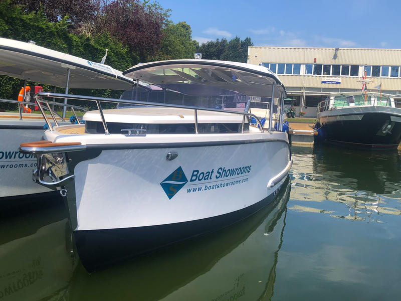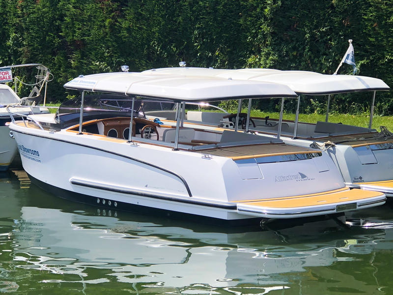 The Prestige Line 23 Cabin is fully electric with an Piktronic 10kW engine. Built in 2018, she's a perfect river/lake cruiser, able to carry 8 passengers. She offers a spacious teak cabin and double bed, with convertible seats, a large rear bathing platform, a sun deck with permanent high quality sunbathing cushions and the unique and smart hardtop hydraulic roof. The hard top roof and cabin roof can be raised and lowered to offer protection from the weather, for added security, and in the cabin offer further headroom.
